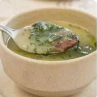 Delicioso & Saboroso Caldo Verde. Feito com creme de batata cozida, couve,...
