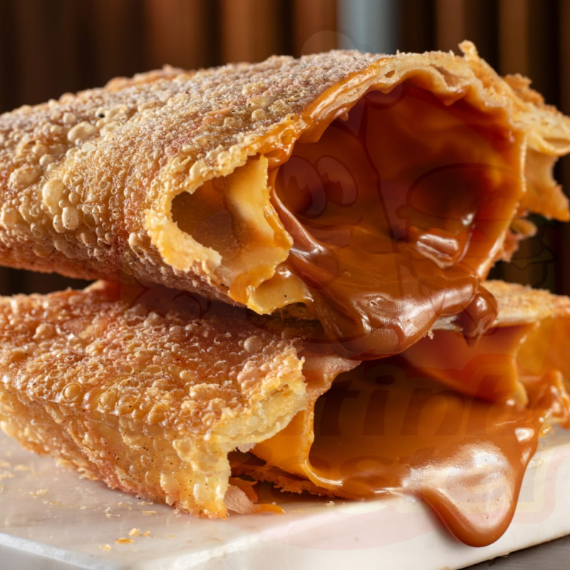 PASTEL SEQUINHO COM DOCE DE LEITE, POLVILHADO COM AÇUCAR E CANELA.