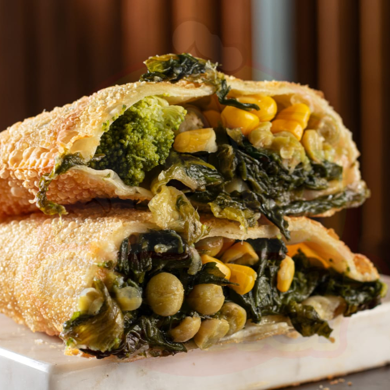 Pastel sequinho e crocante de Escarola, brócolis, palmito, milho e ervilha