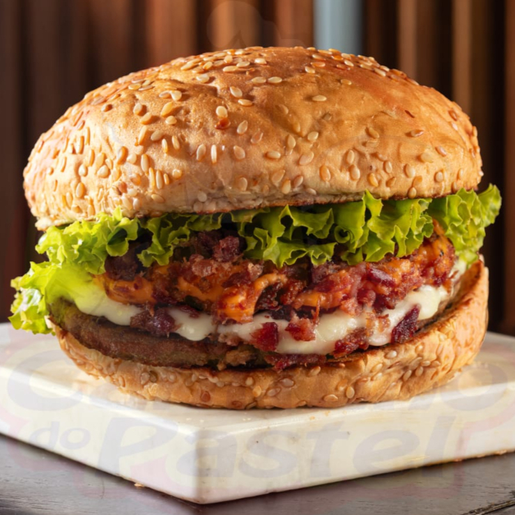 PÃO GERGILIM, QUEIJO, ALFACE E TOMATE, MAIONESE,NOLHO ESPECIAL, CARNE, CALABRESA TRITURADA, CHEDDAR E BATATA PALHA.