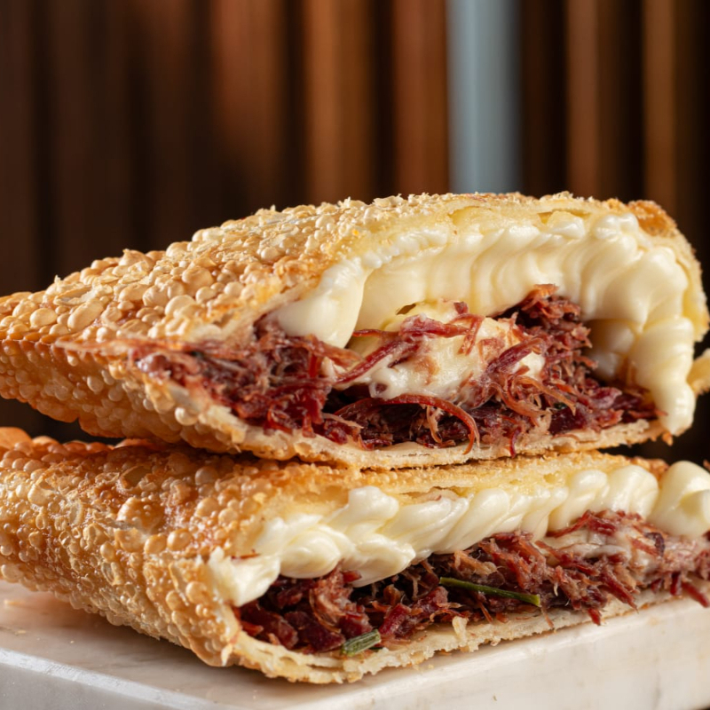 Pastel sequinho e crocante de carne seca com cream cheese