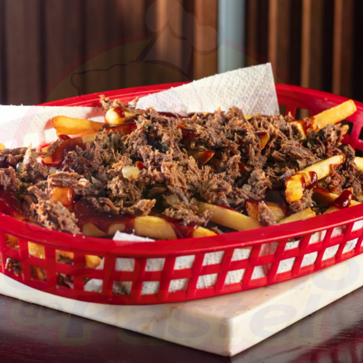 Porção de batata frita com uma deliciosa carne louca e barbecue
