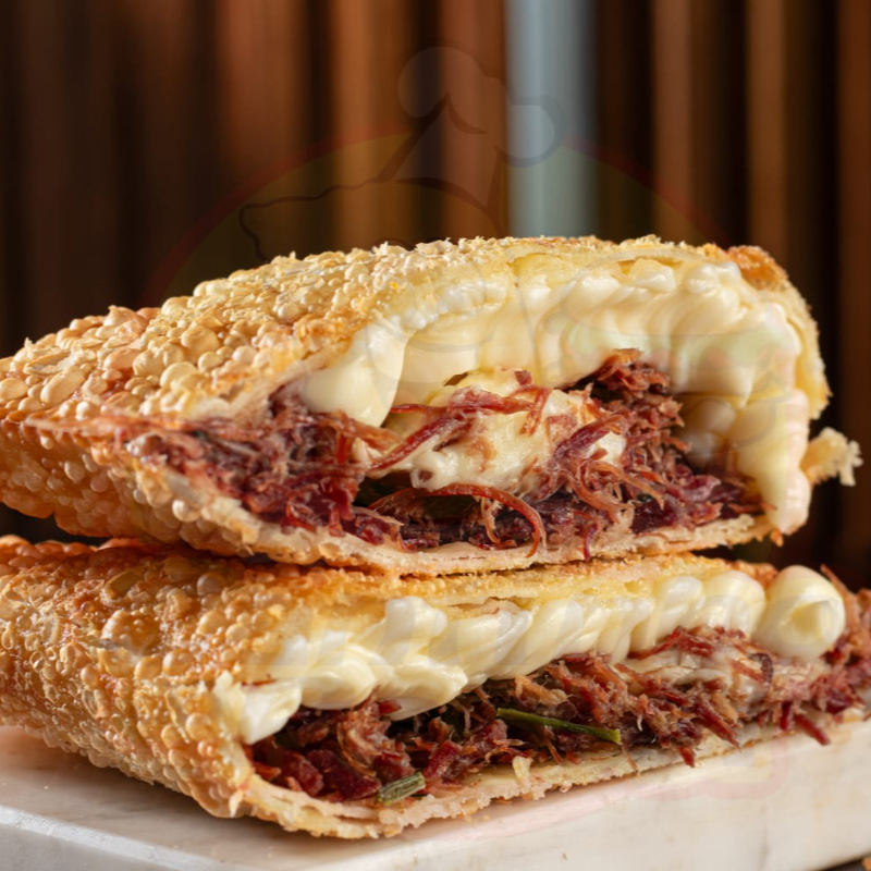 Pastel sequinho e crocante de carne louca suculenta com cream cheese