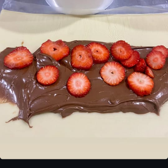PASTEL SEQUINHO COM NUTELLA ORIGINAL E MORANGOS FATIADOS.