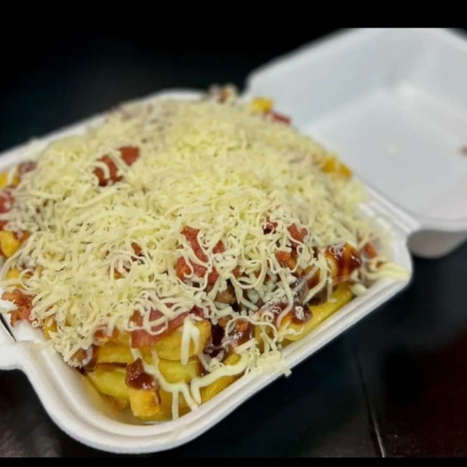 Batatas, maionese, Ketchup, cheddar, queijo ralado e bacon