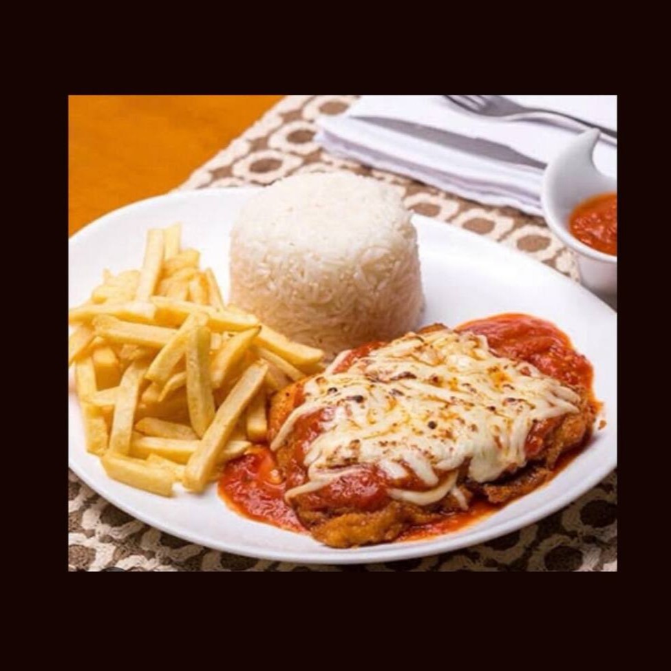 Arroz, feijão, frango a Parmegiana, batata frita
