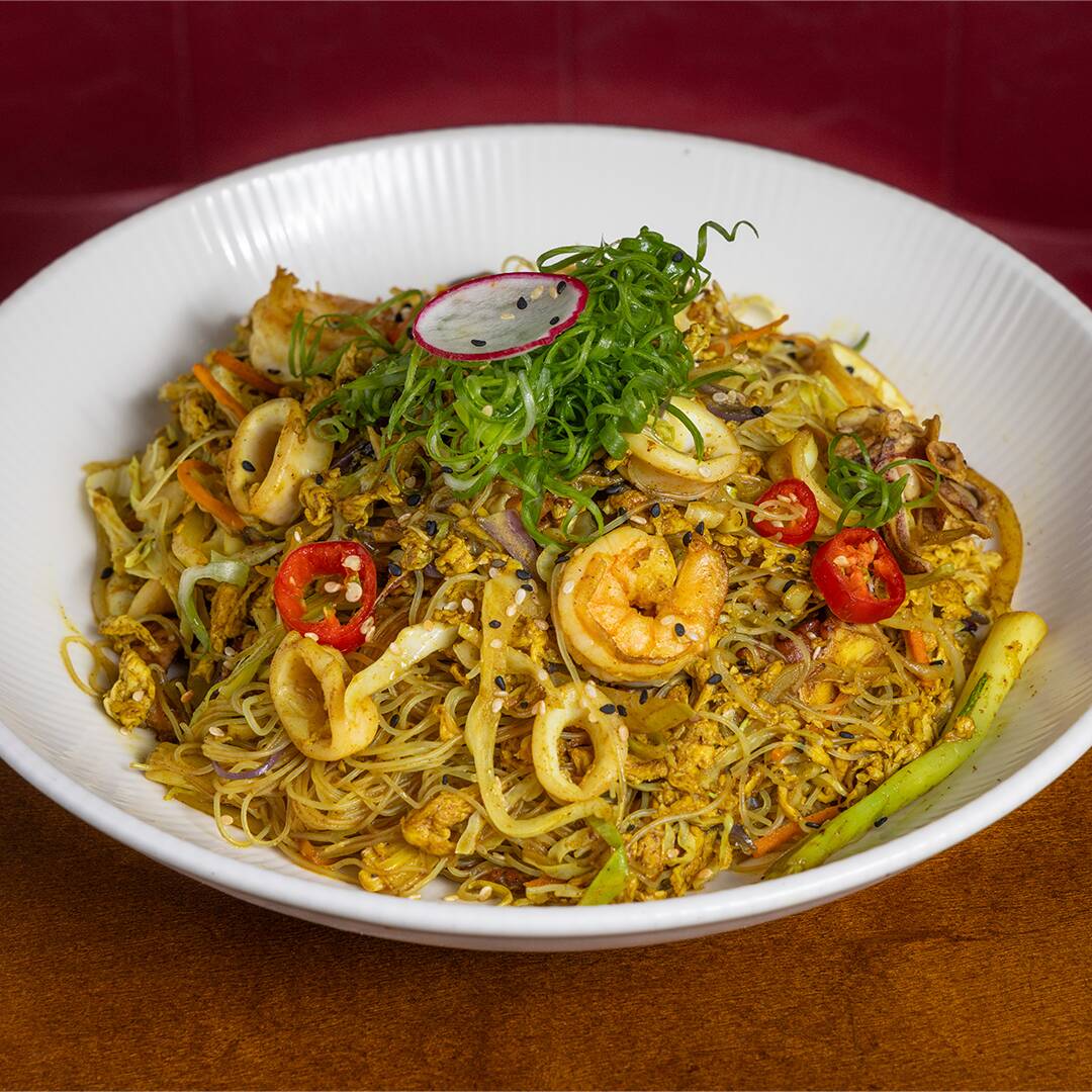 Macarrão de arroz mayfan ao wok com curry, camarão, polvo e lula.