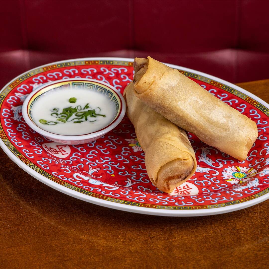Rolinhos fritos, recheados de porco assado e vegetais, acompanhado de molho de tamarindo e 5-spice dressing. (2 un.)