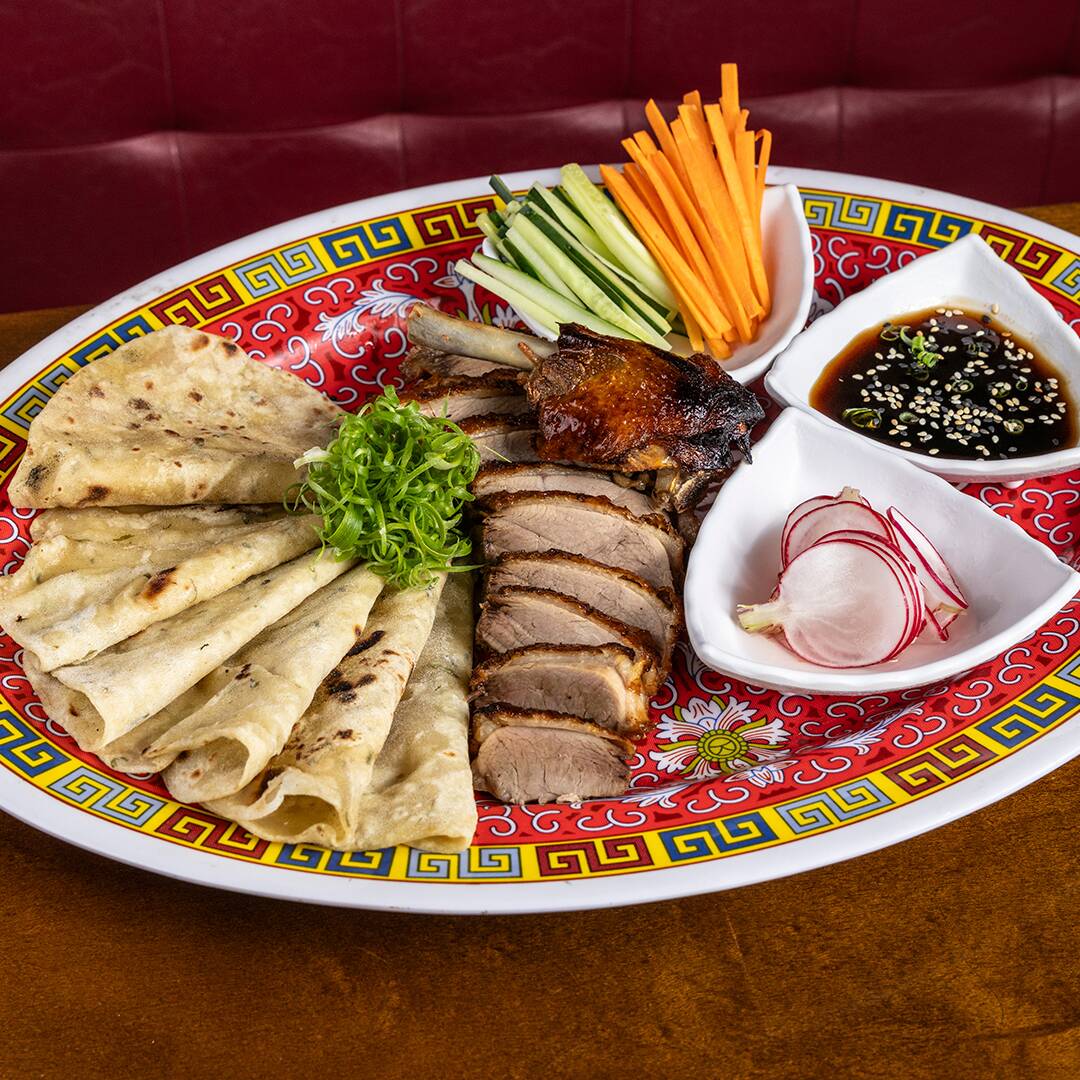 Magret de pato macio e pele crocante, com vegetais, molho hoisin, pimenta cantonesa e panquecas.