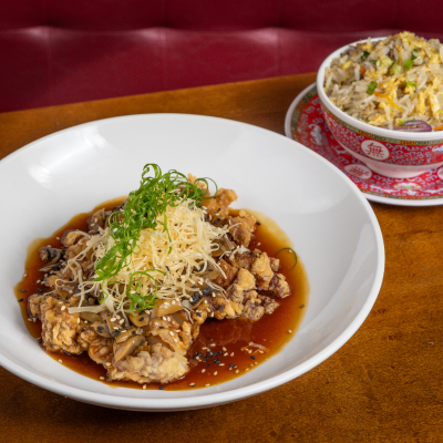 Frango desossado crocante, com molho cantón e cogumelos, omelete chinês e arroz frito cantón.