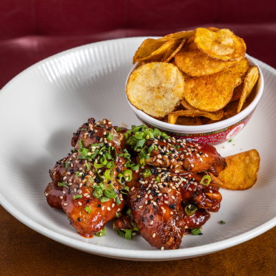 Tulipas de frango frita, molho coreano apimentado e chips de batata.