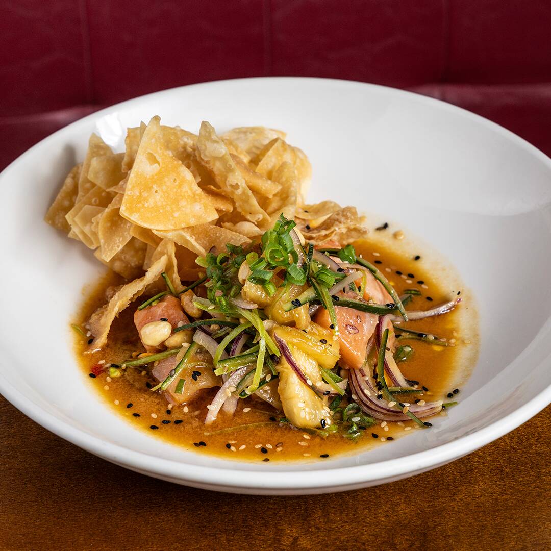 Salmão. leite de tigre oriental, pepino, cebola, ervilha torta e wonton frito.