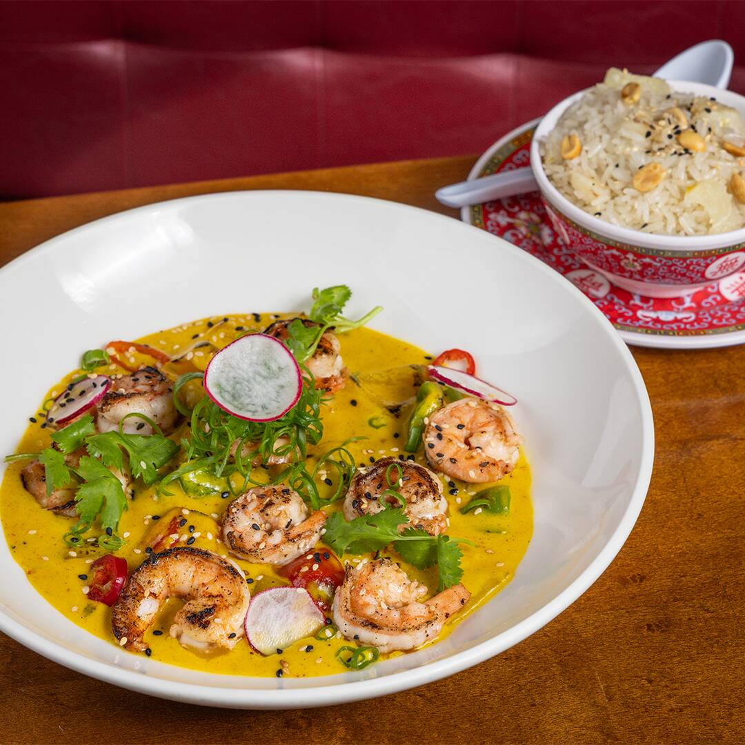 Camarrão com molho cremoso de curry amarelo, leite de coco e creme de leite, acompanhado de arroz frito com abacaxi e amendoim.