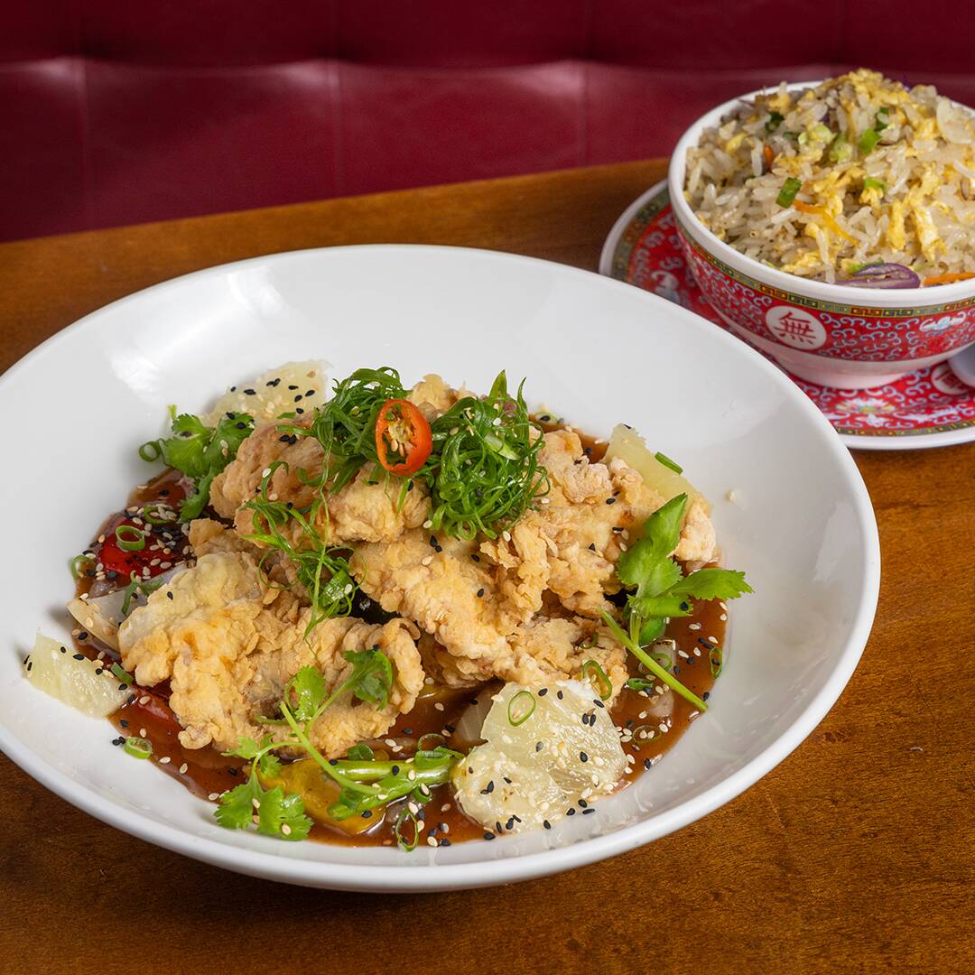Filé suíno crocante, com vegetais e abacaxi refogados na wok com molho agridoce de tamarindo acompanhado de arroz frito cantón.