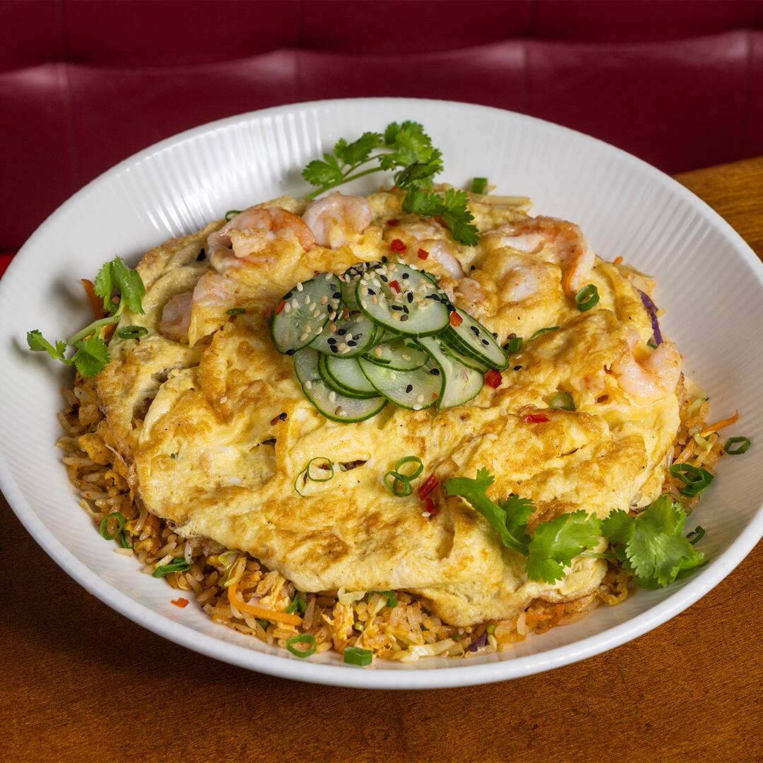 Arroz frito ao wok com frango, ovo e palha de wonton frito, acompanhado de molho de tamarindo.
