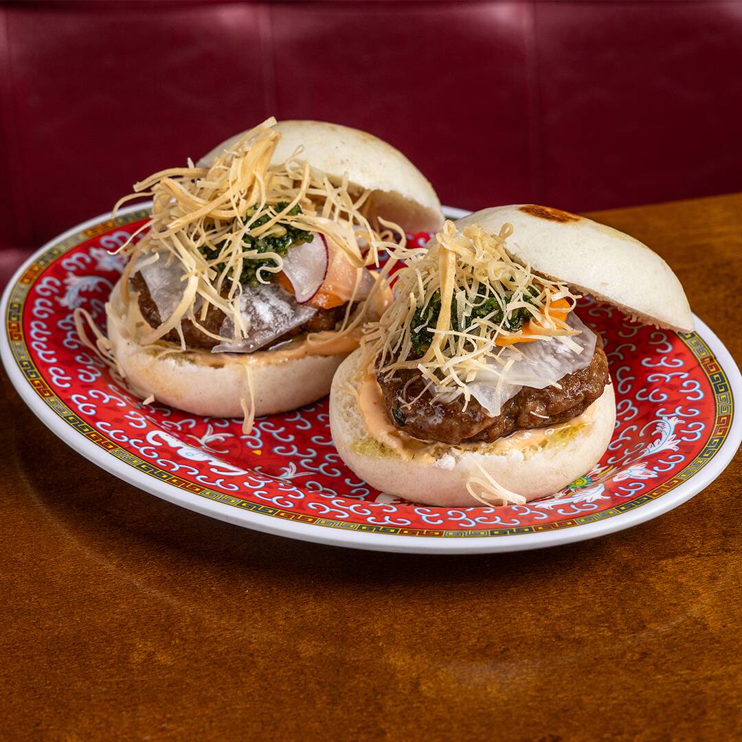 Bao ao vapor com hambúrguer de linguiça, temperos orientais, chimichurri oriental e maionese apimentada com picles. (2 un.)