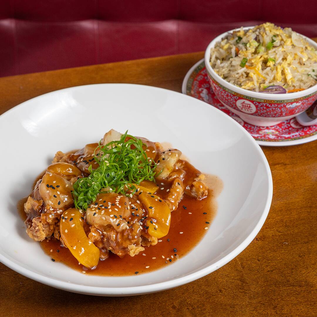 Frango desossado crocante com molho agridoce, abacaxi e pêssego com arroz frito cantón.