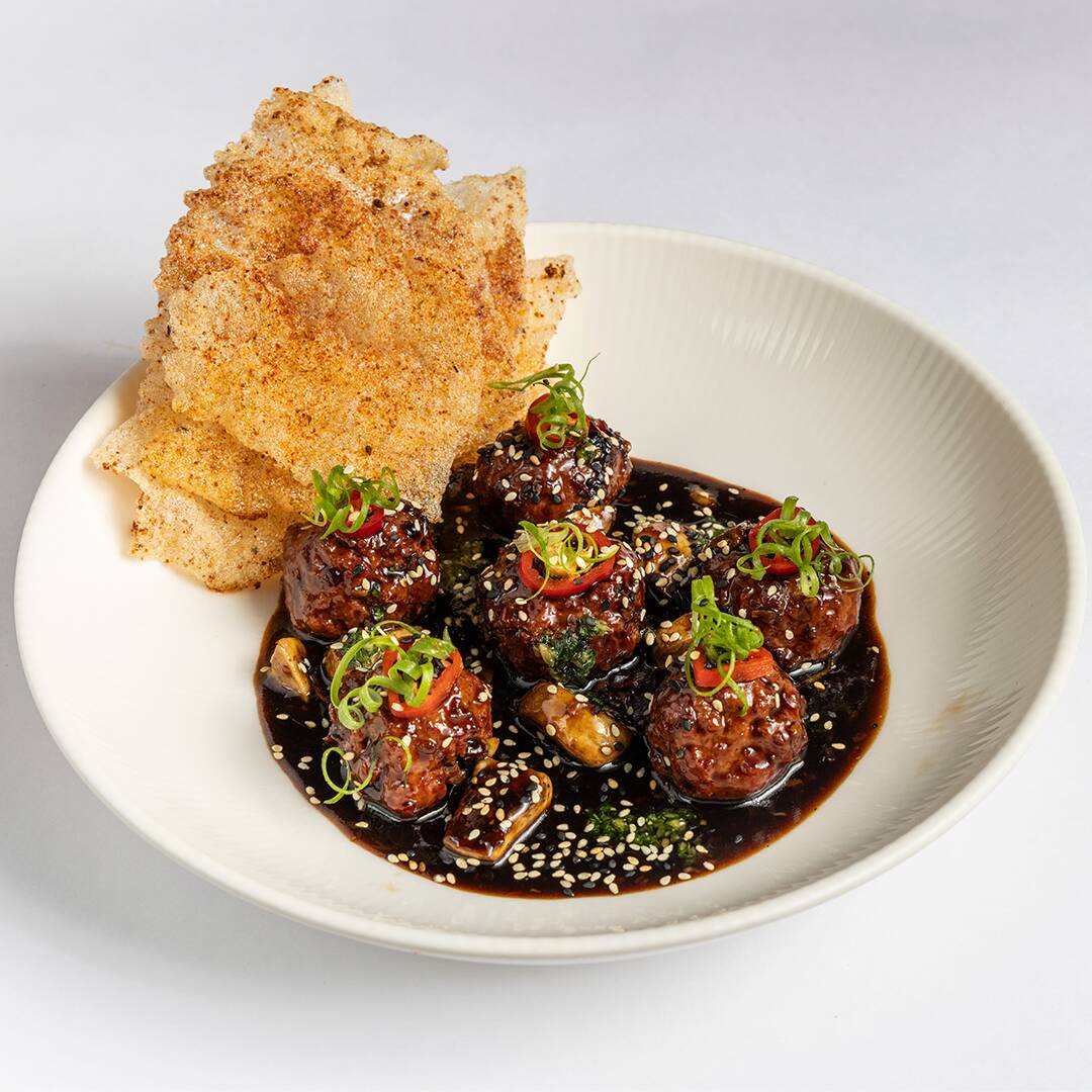 Carne moída com tempero chinês, pimenta sichuan e vegetais com crocante de arroz.