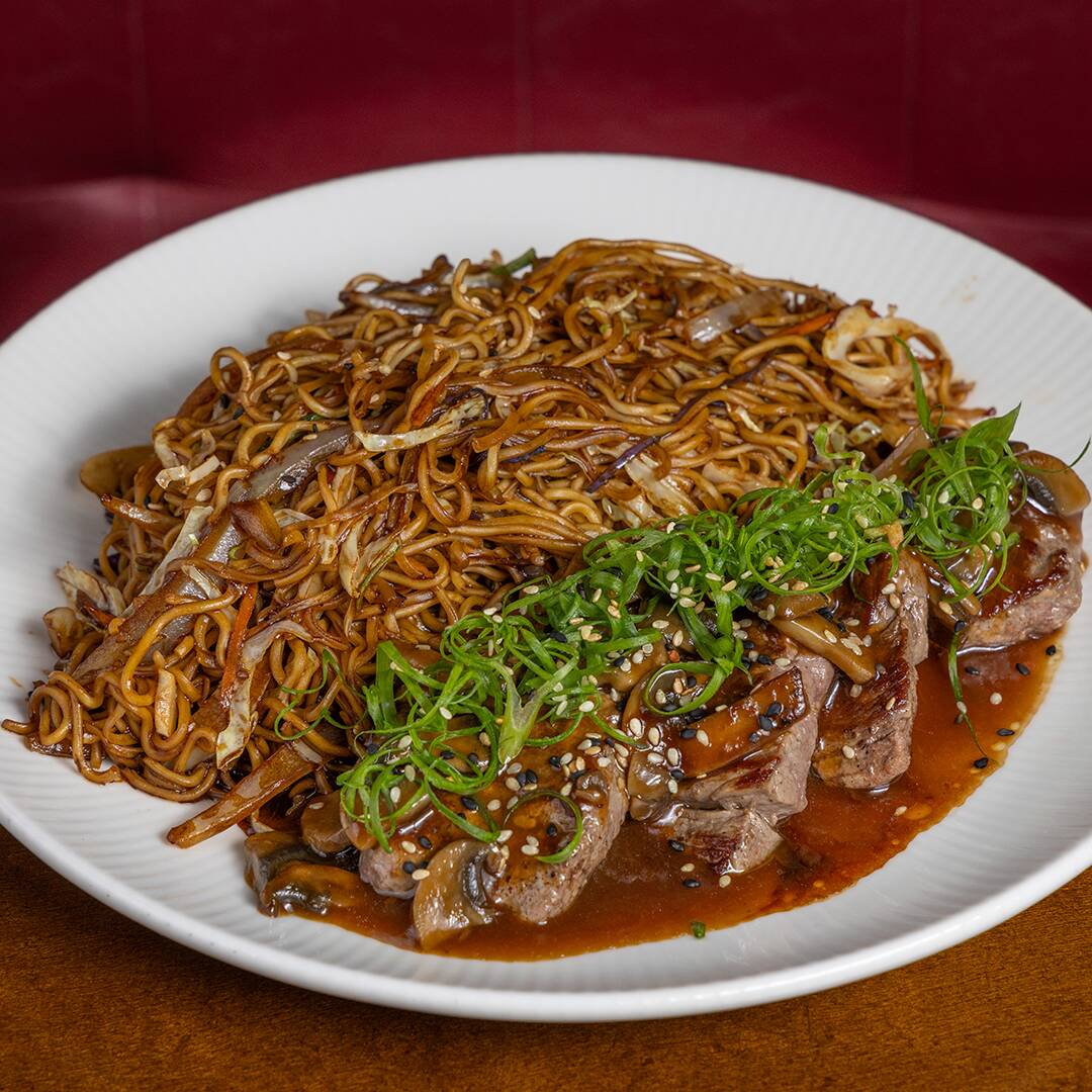 Macarrão ao wok com mix de vegetais, brotos de feijão e filé mignon ao ponto, no molho de cogumelo.