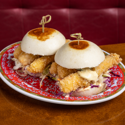 Bao ao vapor com hambúrguer de linguiiça, temperos orientais, chimichurri oriental e maionese apimentada com picles. (2 un.)
