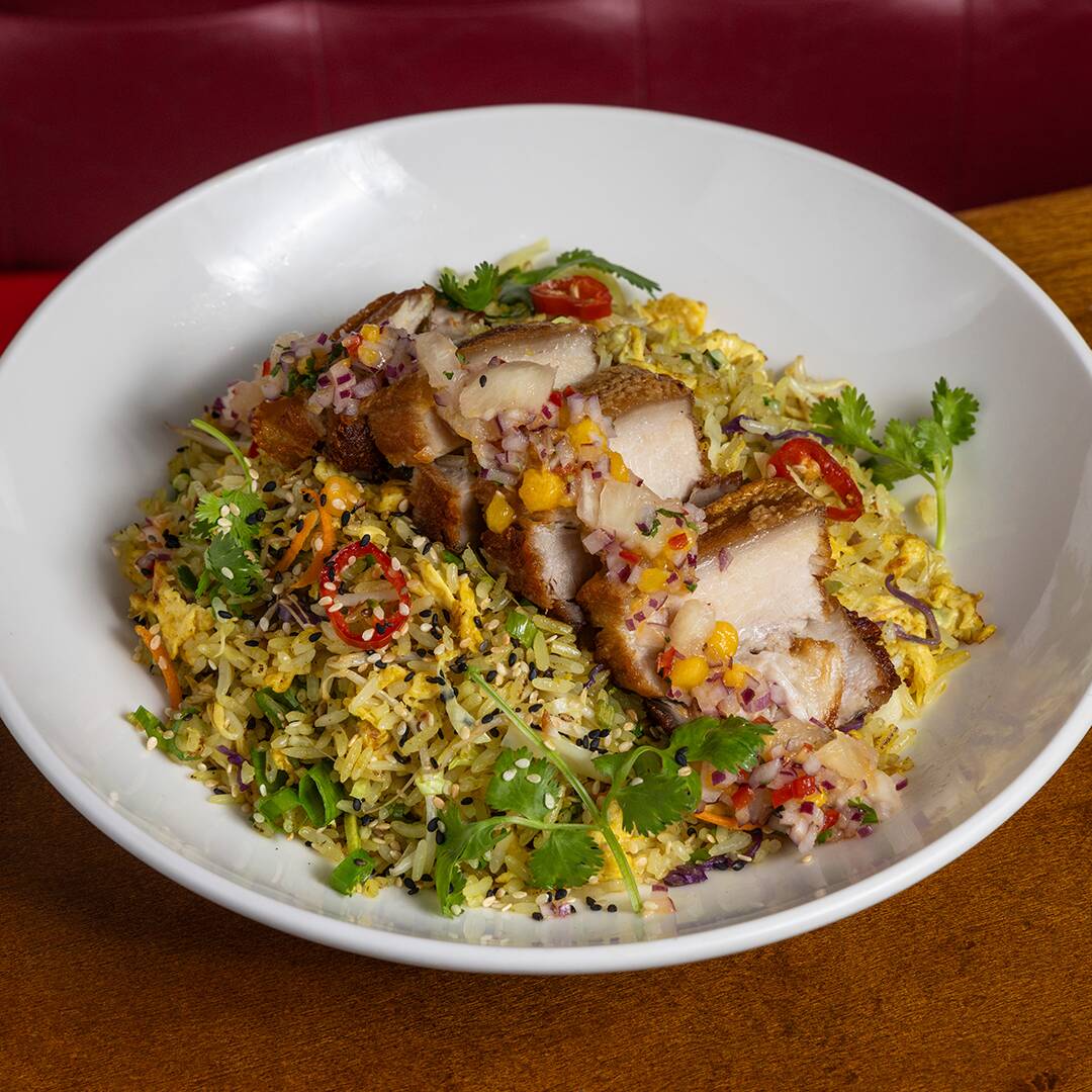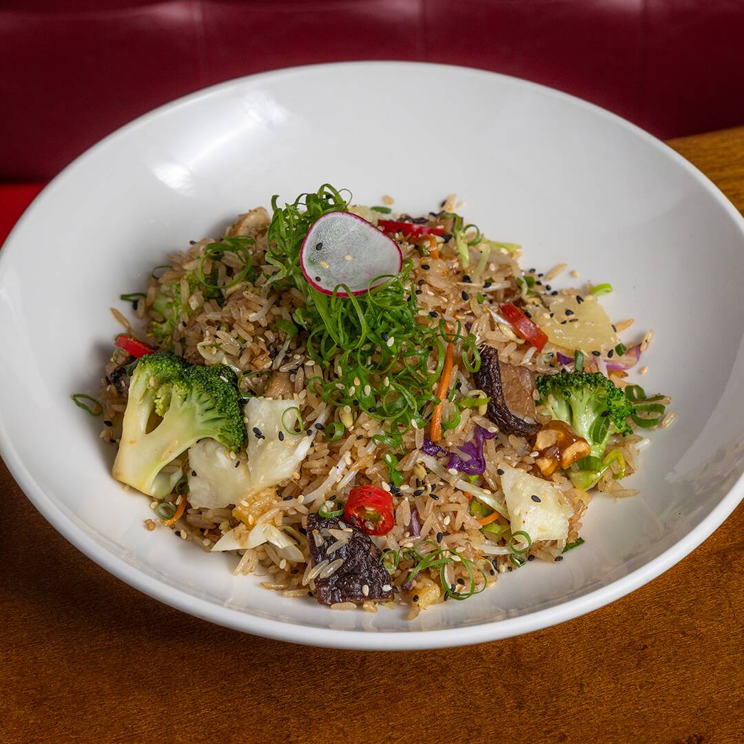 Arroz frito ao wok com cogumelos shitake, legumes, praliné de amendoim, coentro e picles de abacaxi.