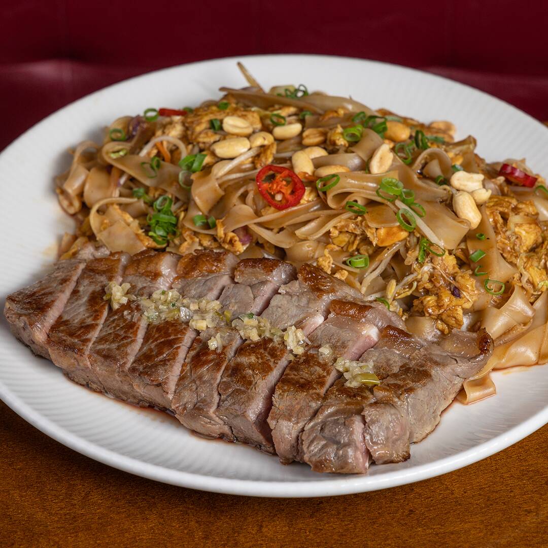 Bife de chorizo grelhado com molho cantonês e macarrão de arroz, com amendoim, molho de shoyu apimentado, broto de feijão e cebola.