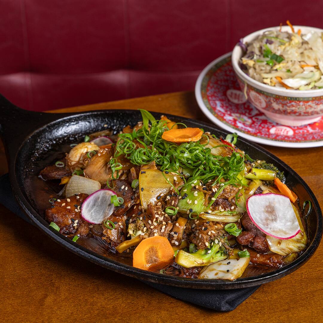 Frango, porco, pato, vegetais, ovo de codorna e molho cantonês com arroz frito, broto de feijão e macarrão chinês.