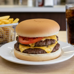 Hambúrguer, queijo prato, cheddar, tomate, alface e maionese. Acompanha batata frita.