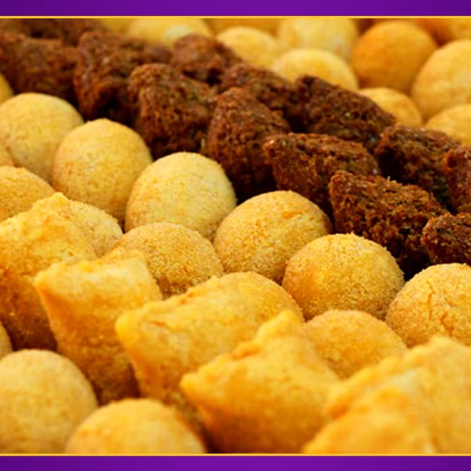 Salgados de festa que fazem sucesso: coxinhas crocantes, risoles de pizza suculentos, bolinhos de calabresa, bolinhos de queijo derretido e kibis perfeitos!