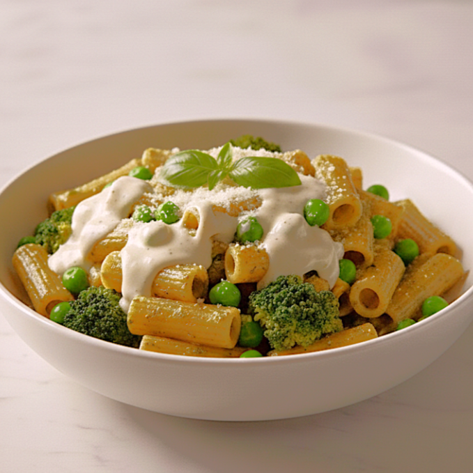 Rigatoni sem glúten envolto em um molho verde vibrante e cremoso, preparado com ervilhas, brócolis, espinafre e o frescor do pesto de ervas. Um prato leve, nutritivo e cheio de sabor, perfeito para quem busca comer bem sem abrir mão da delícia.