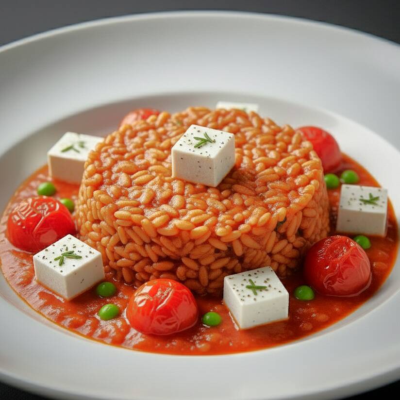 Arroz de aveia corte rustico especial, molho rústico de tomate italiano e manjericão, tomate confit, ervilhas frescas e tofu marinado.