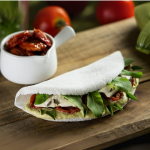 Deliciosa massa de tapioca recheada de queijo mussarela de castanha, tomatinhos temperados e rúcula.