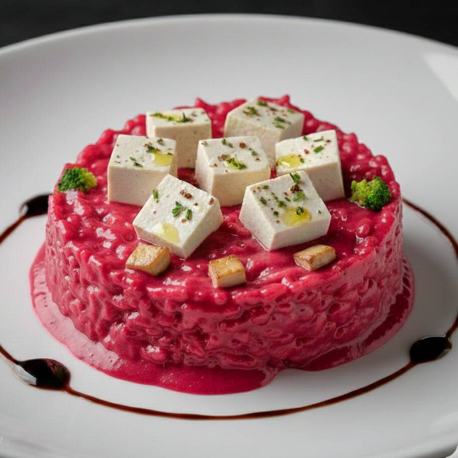Risoto Terra e Brasa - Uma releitura inovadora do clássico risoto, feito com aveia cremosa em um delicado creme de amêndoas e beterraba, trazendo suavidade e um toque levemente adocicado. O brócolis adiciona frescor e textura, enquanto os cogumelos defumados elevam a complexidade dos sabores. Finalizado com cubos de tofu marinados e selados à perfeição, coroados por uma redução de balsâmico.