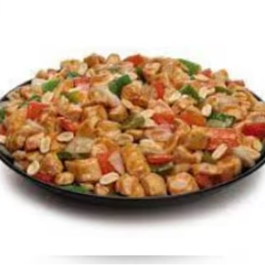 Cubos de peito de frango com cebola, pimentão e amendoim.