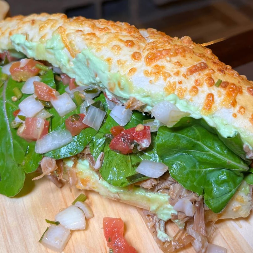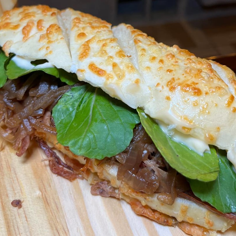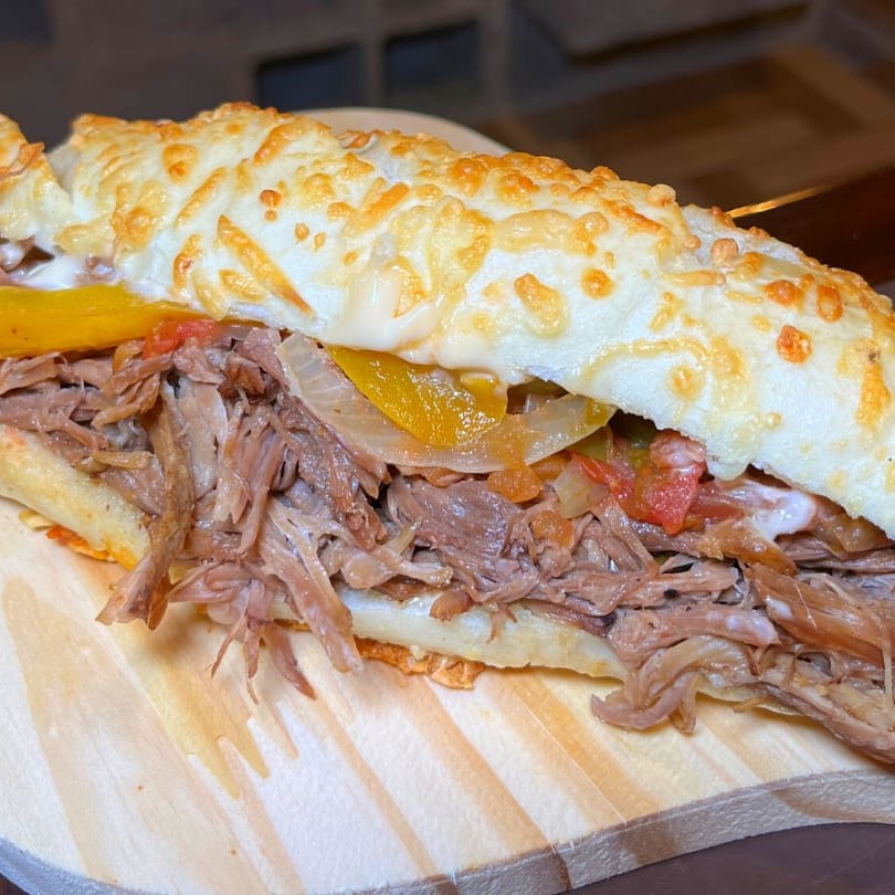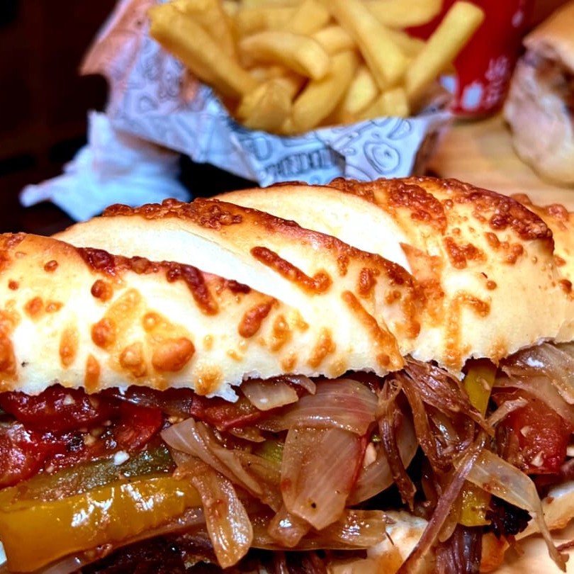 Lanche de costela desfiada, refogado de tomate, cebola, pimentão verde e amarelo, maionese. Você escolhe no pão francês ou na baguete parmesão de 20 cm.