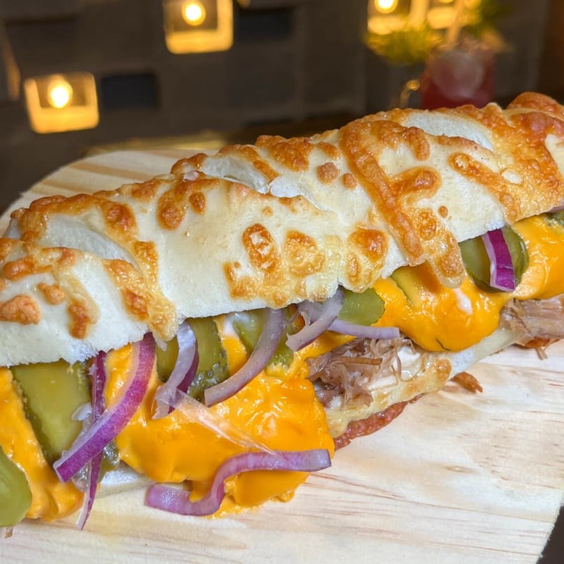 Lanche com muita costela desfiada, cheddar cremoso, cebola roxa, picles e maionese Heinz