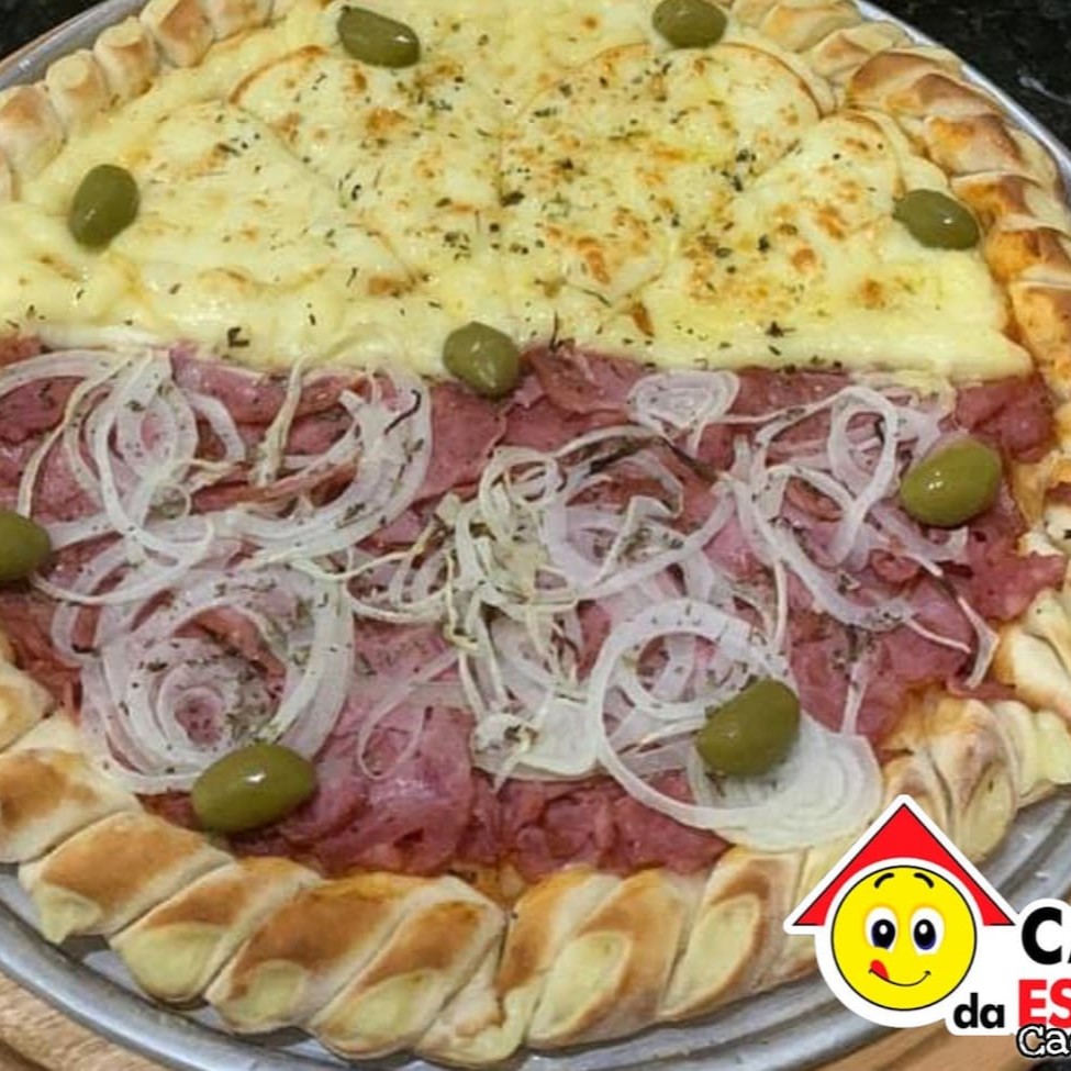 Deliciosa pizza grande (8 pedaços) com duas opções de sabores à sua escolha.
