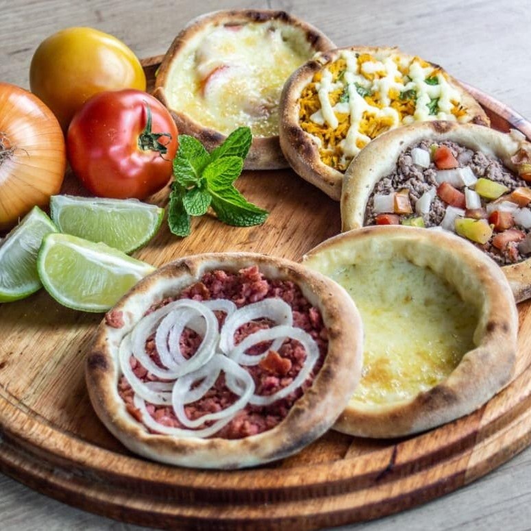 5 esfihas de carne, 5 esfihas de queijo, 5 esfihas de calabresa e 5 esfihas de frango.