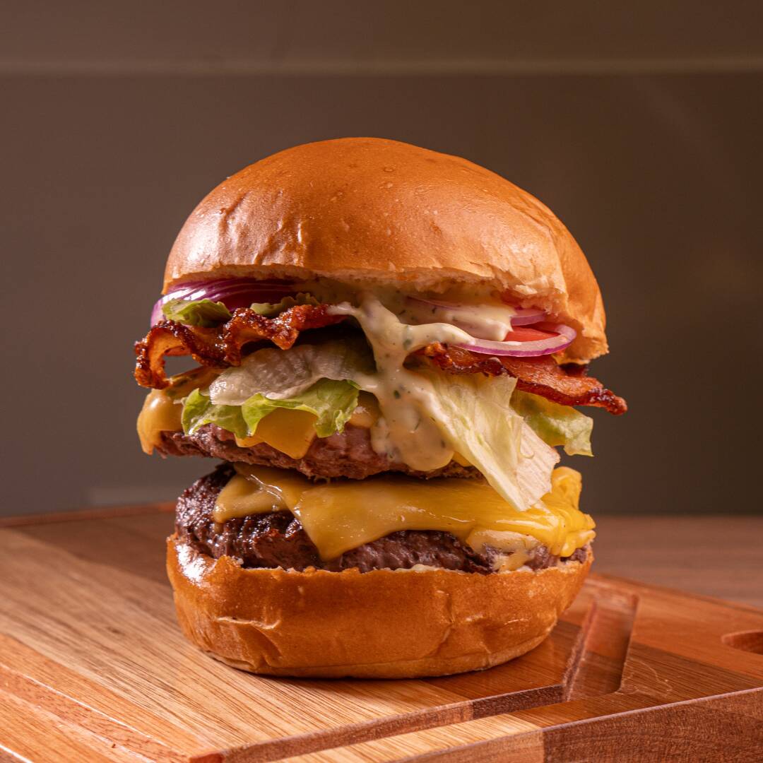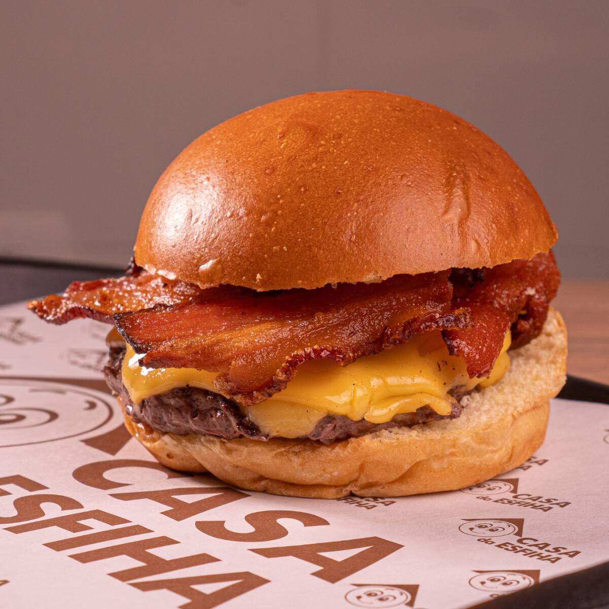 Pão, hambúrguer 150g, bacon, queijo cheddar e maionese.