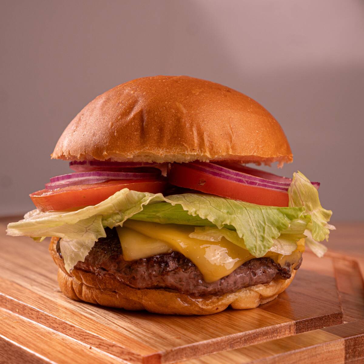 Pão, hambúrguer 150g, queijo cheddar , salada e maionese.