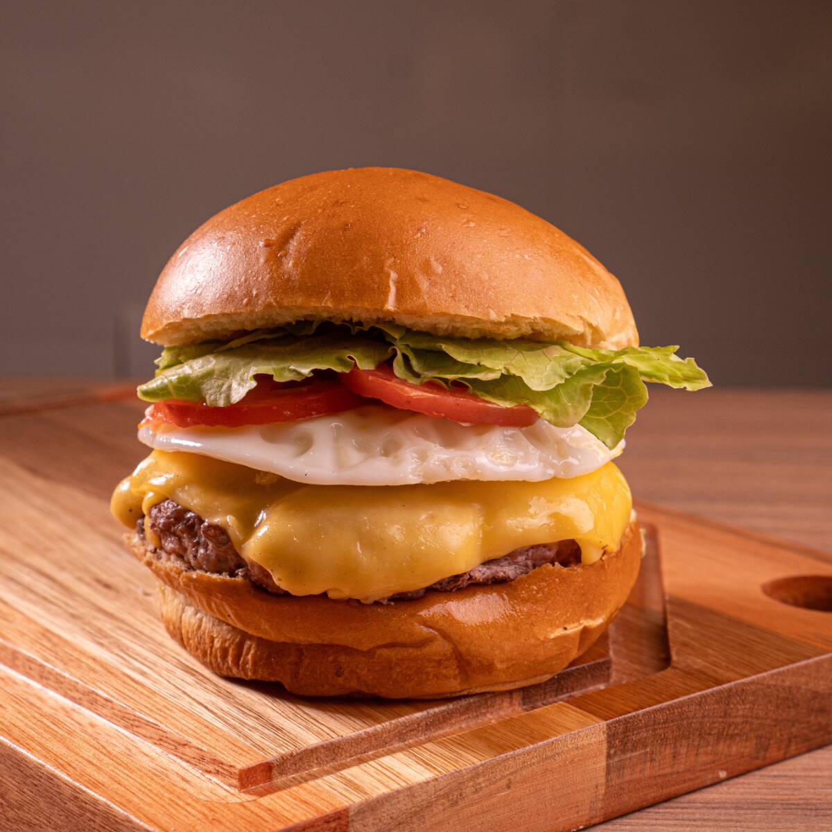 Pão, hambúrguer150g, ovo e queijo cheddar.