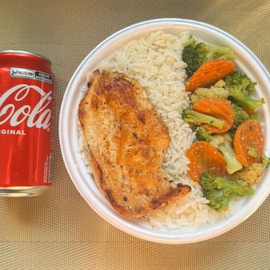 Marmita com delicioso filé de frango grelhado acompanhado de arroz branco, feijão e mix de legumes. Acompanha refrigerante lata Coca Cola 350ml bem gelada. Marmita indicada para 01 pessoa.