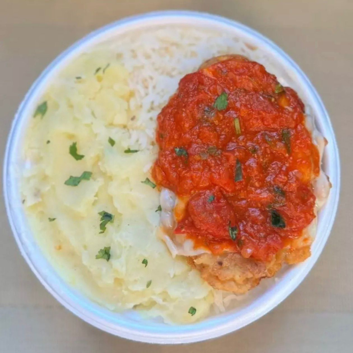 Marmita com Delicioso Filé de frango a parmegina ( Epanado na massa crocante coberto com molho de tomate e queijo ) Arroz branco e fritas 01 pessoa