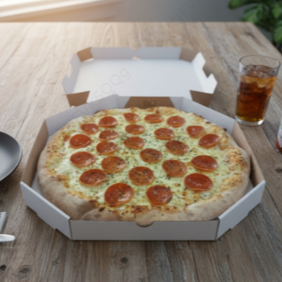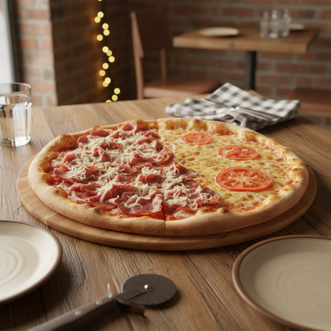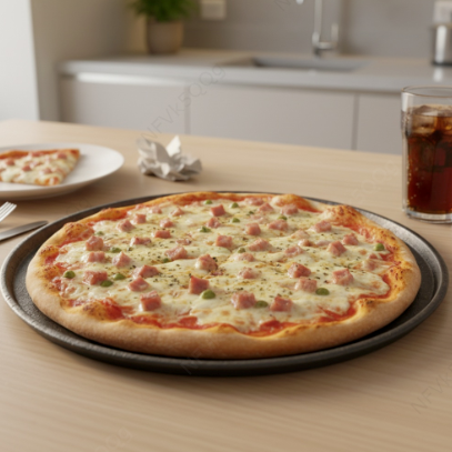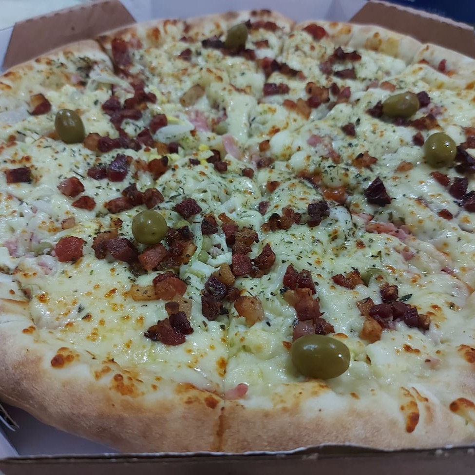 Massa artesanal, molho de tomate, presunto, ovo, ervilha, cebola, mussarela, bacon, azeitonas e orégano.