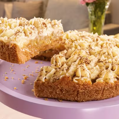 Uma clássica sobremesa inglesa diretamente para a mesa da sua casa! Uma torta que combina uma massa crocante de biscoitos amanteigados com camadas generosas de doce de leite e banana, cobertas por chantilly caseiro e um leve toque de cacau.