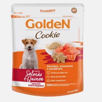 "Para tornar os momentos mais divertidos e prazerosos junto ao seu cão, a PremieRpet® desenvolveu a linha GoldeN Cookie, resultado da perfeita combinação de qualidade e sabor, com cookies assados, crocantes e saudáveis. GoldeN Cookie é cuidadosamente preparado com ingredientes selecionados, contém baixo teor de sódio, sem corantes e aromatizantes artificiais e sem ingredientes transgênicos. Produzido em uma das fábricas mais modernas do mundo, com equipamentos próprios para a fabricação de biscoitos humanos, os nossos cookies são inovadores e diferentes de todos os produtos encontrados até hoje no mercado. GoldeN Cookie Salmão & Quinoa é adequado para cães adultos de porte pequeno. Este produto oferece uma combinação exclusiva de salmão e quinoa, que confere um sabor irresistível. Outra exclusividade deste alimento são os ovos provenientes de galinhas criadas livres de gaiolas, atestados através do selo Cage Free."