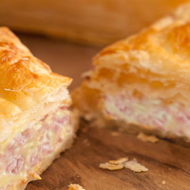 Massa folhada com recheio de peito de peru e queijo. Direto do nosso forno até sua porta.