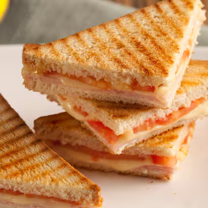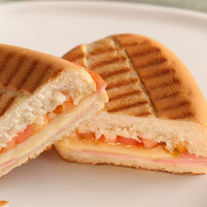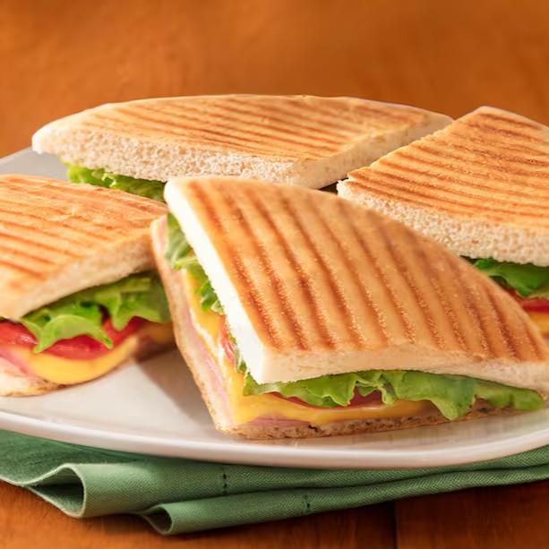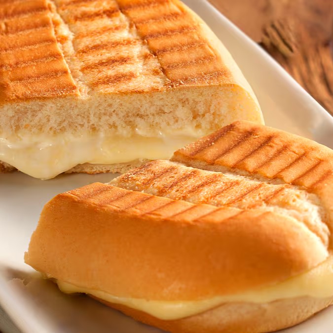 Nosso delicioso pão de queijo prensado com recheio de presunto e queijo. Para um lanche inesquecível.
