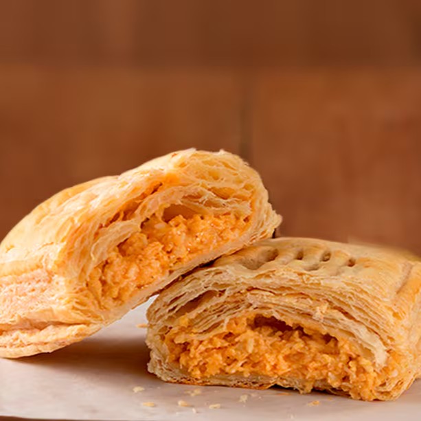 Massa folhada com recheio de frango com requeijão. Direto do nosso forno até sua porta.