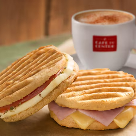 Nosso delicioso pão de queijo prensado com recheio de presunto e queijo. Para um lanche inesquecível.